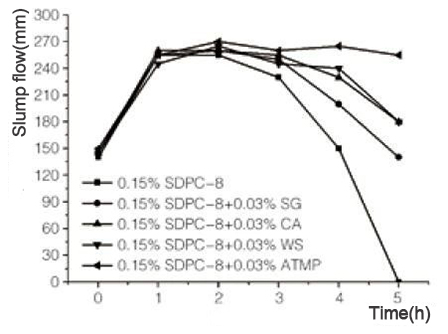 The influence of different retarders on the expansion of reference cement paste is shown in Figure 3. It can be seen from Figure 3 that with the addition of sdpc-8, the expansion degree of the reference cement paste reaches the maximum value of 270 mm in 1 h, which is 130 mm higher than the initial value, and begins to lose after 2 h, and completely loses its fluidity in 5 h. The addition of retarder can prolong the retention time of cement paste in varying degrees, and the extent of prolonging the retention time of cement paste is ATMP > WS > CA > SG. When ATMP content is 0.03% and sdpc-8 content is 0.15%, the retention time of the slurry is the longest, and the expansion of the slurry can still reach 260mm after 5h, which is 120mm higher than the initial. That is to say, the addition of retarder can improve the retention performance of polycarboxylate superplasticizer, but different retarders have different auxiliary retention effects.