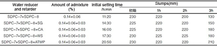 The working performance of concrete prepared with different retarders and water reducing agents is shown in Table 1. It can be seen from table 1 that polycarboxylate superplasticizer also has a certain retarding effect, and with the addition of retarder, the setting time of concrete has different degrees of extension, among which the strongest retarding effect is ATMP. When the dosage is 0.03%, the initial setting time is 20 hours and 50 minutes, which is 8 hours and 30 minutes longer than the blank. The results show that the synergistic effect of the retarder and the retarder is not obvious when the dosage of the retarder is 0.03%.